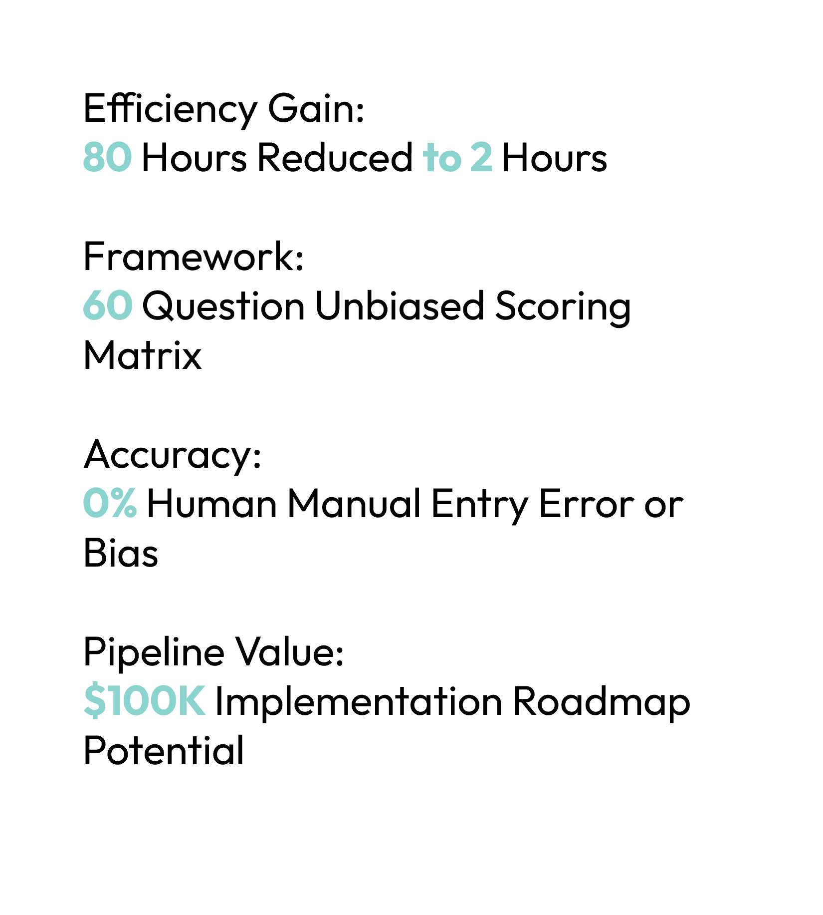 A leading B2B agency had developed a brilliant, research-backed concept for evaluating content effectiveness across the buyer journey. However, the service was stuck in the "concept phase." It lacked an ownable methodology, a repeatable process, and a clear narrative that could win at the Enterprise level. Delivering the analysis manually would have required 40–80 hours of senior-level labor per client, introducing significant opportunity for human bias and making the service nearly impossible to scale or price competitively.