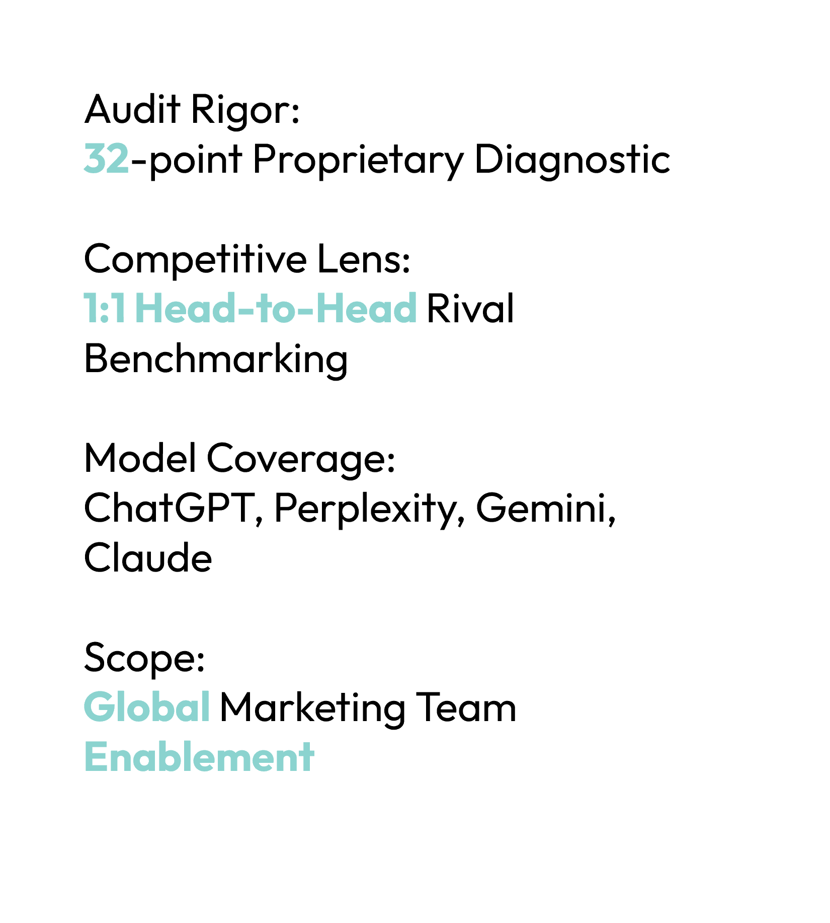 I deployed my proprietary AI Search Readiness Assessment + Blueprint to conduct a deep-dive analysis of the manufacturer’s digital presence against its primary global rival. This strategic engagement included: